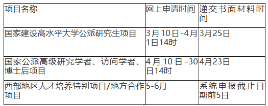 每个项目的网上申请时间以国家留学网项目指南公布的时间为准,申请人经所在单位审核并出具单位推荐意见后,每个项目申报截止前,提前5个工作日将所需书面申请材料报送至国际合作与交流处,逾期将不予受理。下表为部分项目申报时间安排,其余项目请自行登录国家留学网查询。